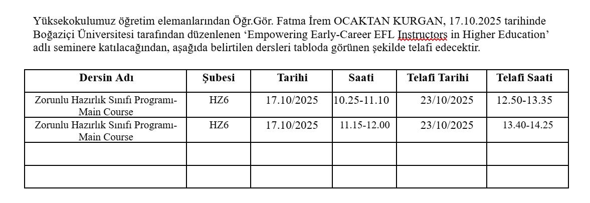 Öğr. Gör. Fatma İrem OCAKTAN KURGAN'nın Ders Telafisi Hakkında Duyuru
