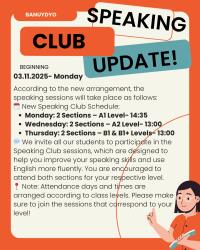 Okulumuzun Speaking Club programında güncelleme yapıldı! Yeni düzenlemeye göre konuşma kulübü oturumları aşağıdaki şekilde gerçekleştirilecektir: