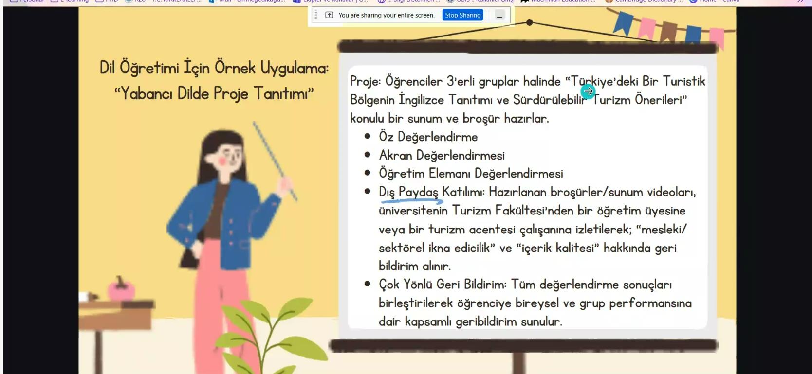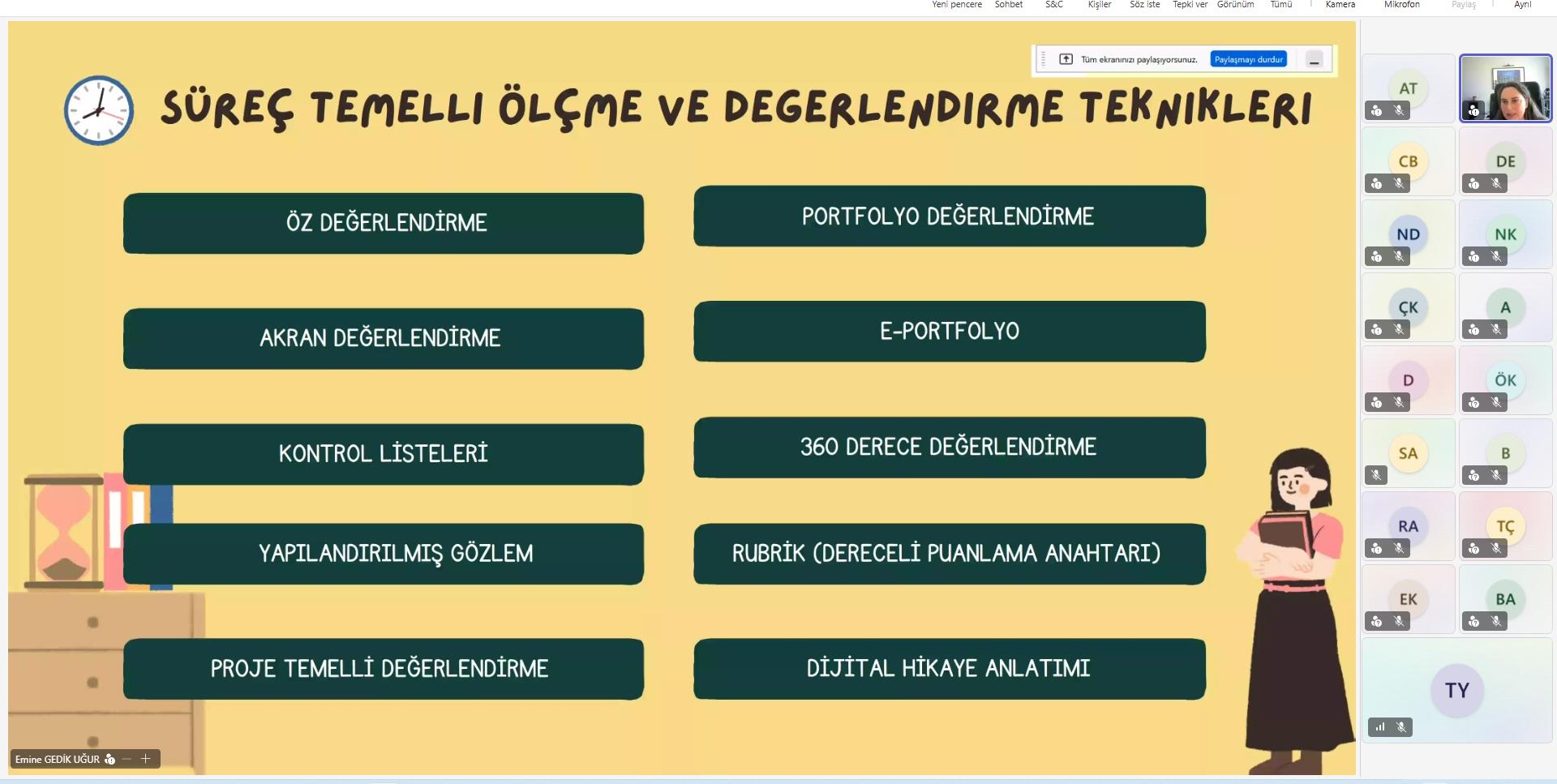 Trakya Üniversiteler Birliği (TÜB) Yabancı Diller Yüksekokulları Alt Çalışma Grupları kapsamında, “Yabancı Dil Eğitiminde İyi Uygulama Örnekleri” teması çerçevesinde 16 Nisan 2026, Perşembe günü saat 15:00’te çevrimiçi bir seminer düzenlenmiştir. Kırklareli Üniversitesi Yabancı Diller Yüksekokulu ev sahipliğinde ve Kırklareli Yabancı Diller Yüksekokulu Müdür Yardımcısı Dr. Öğr. Üyesi Ayfer Tanış Dönmez’in moderatörlüğünde gerçekleşen seminerde, Kırklareli Yabancı Diller Yüksekokulu’ndan Öğr. Gör. Emine Gedik Uğur “Biçimlendirme/Yetiştirme/İzlemeye Yönelik (Formatif) Değerlendirme” başlıklı bir sunum yapmıştır. Süreç temelli ölçme-değerlendirme tekniklerine odaklanılan sunumda, özellikle yabancı dil hazırlık eğitimi bağlamında geleneksel ölçme-değerlendirme yöntemlerinin ötesine geçilmesinin ve öğrenciyi merkeze alan çağdaş modellere yönelmenin gerekliliği vurgulanmıştır. Bu bağlamda süreç temelli ölçme ve değerlendirme tekniklerinin kullanıldığı uygulama örnekleri paylaşılmıştır.