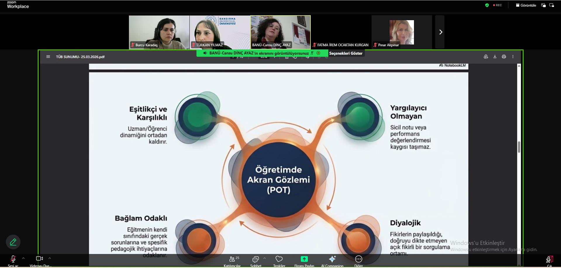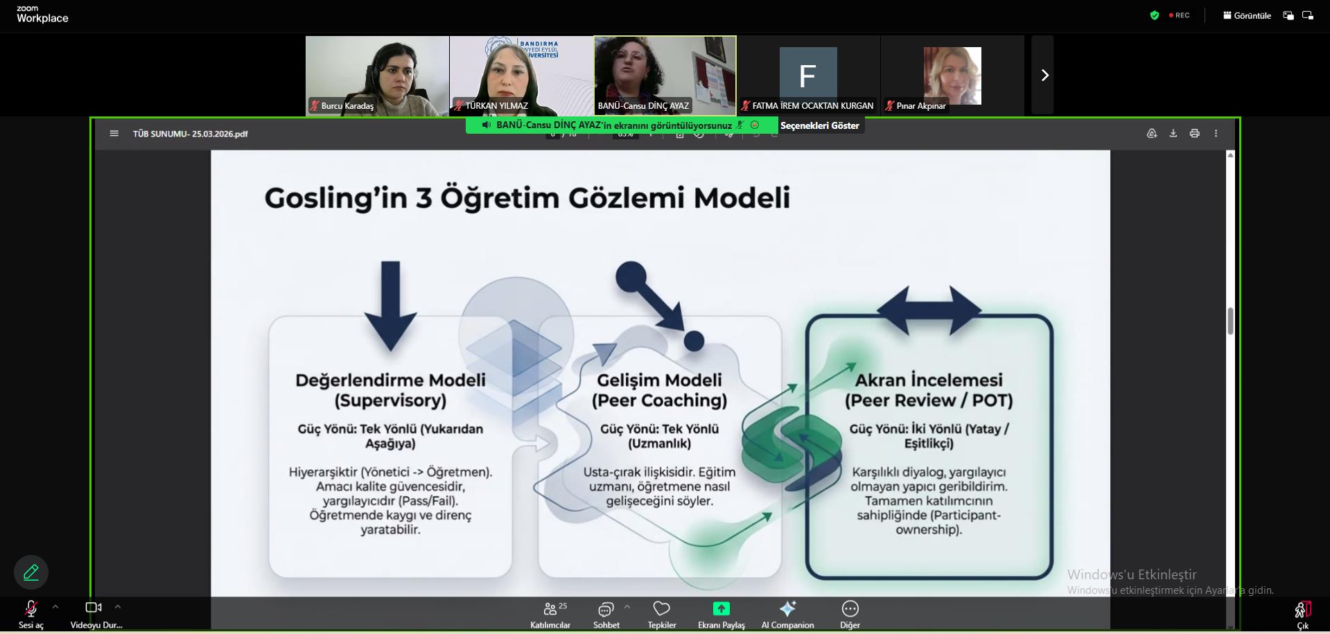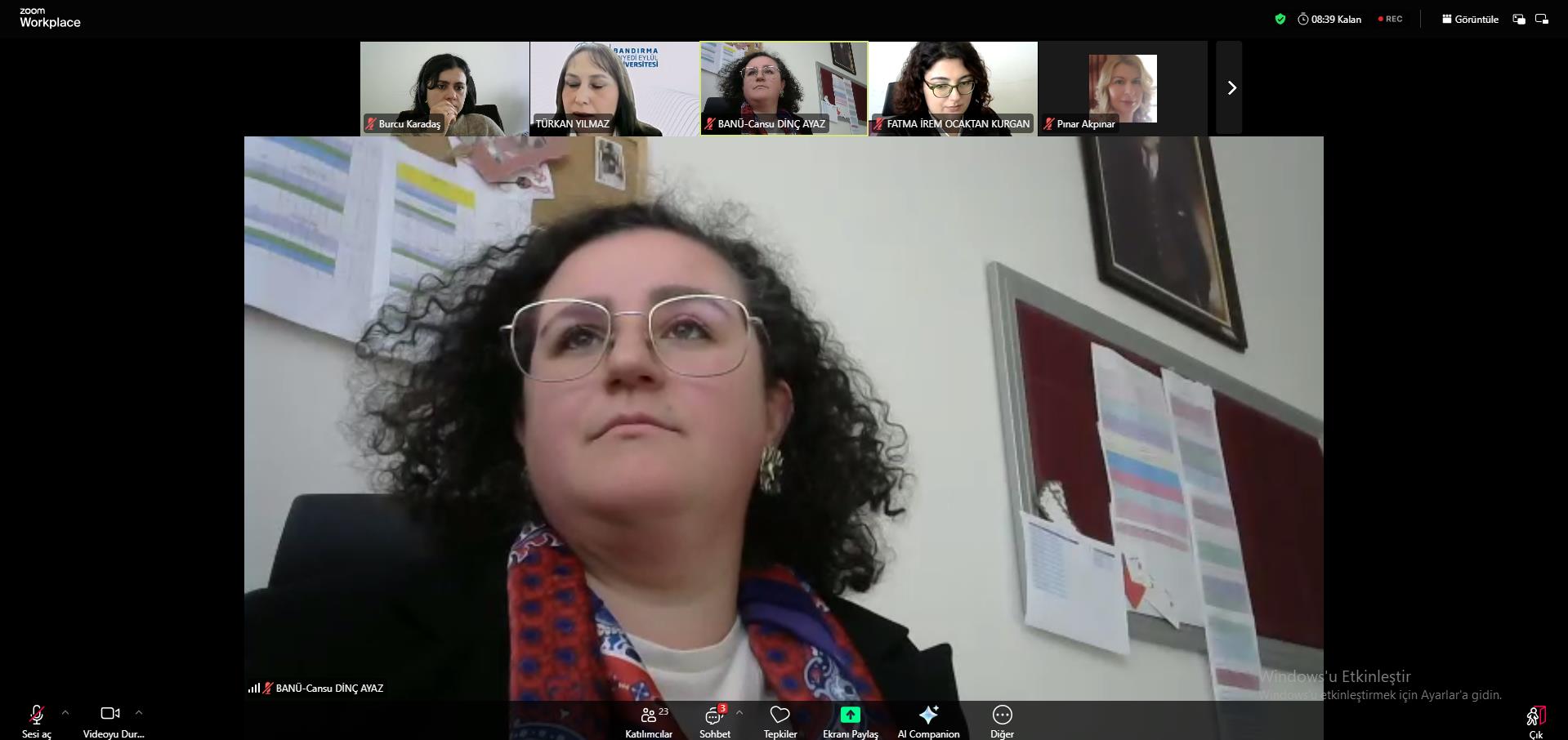 Trakya Üniversiteler Birliği (TÜB) Alt Çalışma Grupları Etkinlikleri kapsamında “Yabancı Dil Eğitiminde İyi Uygulama Örnekleri” bağlamında 25 Mart 2026 tarihinde Bandırma Onyedi Eylül Üniversitesi Yabancı Diller Yüksekokulu’nda bölüm başkanı olarak görev yapan Öğr. Gör. Cansu Dinç Ayaz “Mesleki Gelişim Komisyonu Kurulması: Bandırma Onyedi Eylül Üniversitesi Üzerine Durum Çalışması” başlıklı bir çevrimiçi seminer vermiştir. Seminere, Türkiye’nin farklı üniversitelerinin Yabancı Diller Yüksekokulları’nda görev yapan çok sayıda öğretim görevlisi/üyesi katılım sağlamıştır.