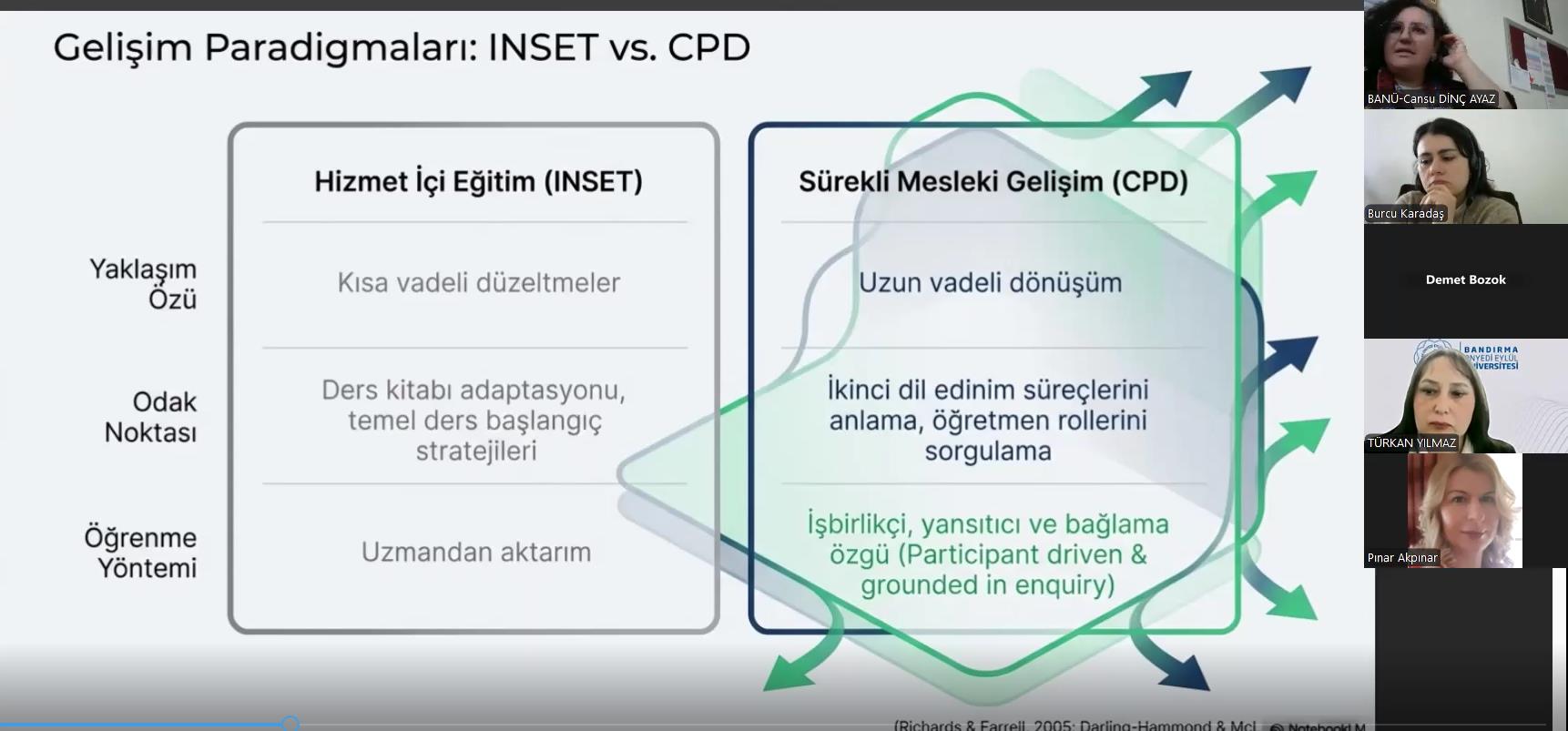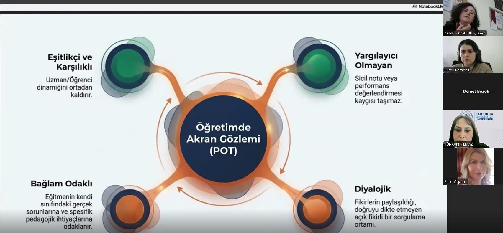 Bandırma Onyedi Eylül Üniversitesi Yabancı Diller Yüksekokulu ev sahipliğinde, Trakya Üniversiteler Birliği (TÜB) Yabancı Diller Yüksekokulları Alt Çalışma Grupları etkinlikleri kapsamında, “Yabancı Dil Eğitiminde İyi Uygulama Örnekleri” teması çerçevesinde 25 Mart 2026, Çarşamba günü saat 16:00 ‘da çevrimiçi bir seminer düzenlenmiştir. Seminer, Yabancı Diller Yüksekokulu Müdürü Öğr. Gör. Türkan Yılmaz moderatörlüğünde gerçekleştirilmiş; Yüksekokulumuz Bölüm Başkanı Öğr. Gör. Cansu Dinç Ayaz tarafından “Establishing a Professional Development Unit: A Case Study on Bandırma Onyedi Eylül University” başlıklı sunum yapılmıştır. Sunumda, yükseköğretim kurumlarında mesleki gelişim süreçlerinin kurumsal bir yapı içerisinde ele alınması, mesleki gelişim komisyonlarının oluşturulması ve bu yapıların sürdürülebilirliğine yönelik uygulama örnekleri
