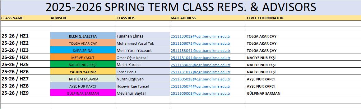 2025-2026 Akademik Yılı Danışmanlık Listeleri ekte yer almaktadır. Buna ek olarak öğretim elemanlarımızın öğrenci görüşme saatlerini Akademik Personel sayfalarından ve ekteki dosyadan takip edebilirsiniz.